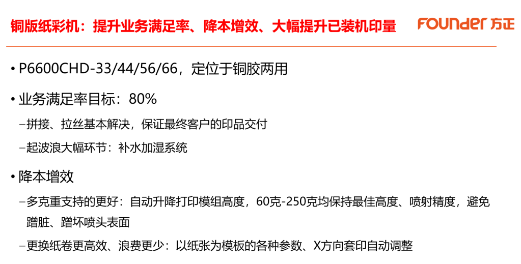 演講中,宗義剛重點介紹了方正應對市場挑戰的最新技術與產品進展。針對銅版紙印刷的痛點,新一代P6600CHD系列彩機定位“銅膠兩用”,通過技術攻堅,旨在將業務滿足率提升到80%,并基本解決銅版紙拼接、拉絲問題。該系列設備還實現了60-250克多克重紙張的自動適配打印,并通過智能化設計,使換卷與套印調整更高效,減少浪費。