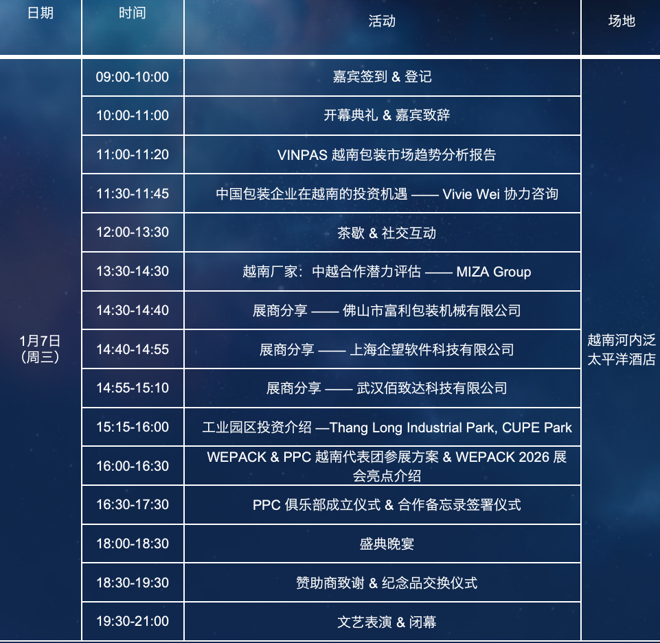 為推動雙方產業深度鏈接、打通跨境合作的資源壁壘,2026年1月7日,WEPACK 2026 世界包裝工業博覽會·越南路演(河內站)將在 河內泛太平洋酒店正式啟幕,為中越包裝產業搭建一個兼具“前瞻研判 × 商務對接 × 投資鏈接 × 工廠實訪”的高含金量平臺。