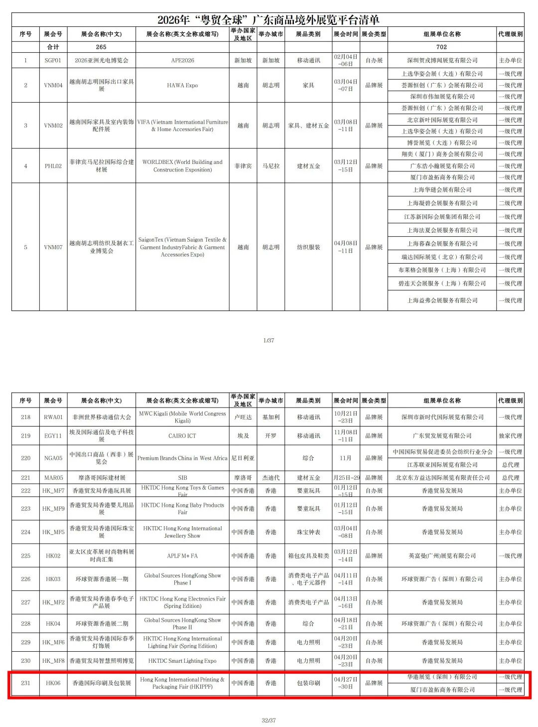 新年伊始,正是擘畫藍圖、布局全年的關(guān)鍵時刻。也正是在這辭舊迎新的節(jié)點上,廣東省商務(wù)廳于近日正式發(fā)布了《2026年“粵貿(mào)全球”廣東商品境外展覽平臺清單》,如同一份及時而至的“新年出海指南”,為全省外貿(mào)企業(yè)新一年的揚帆遠航指明了首批265個星光坐標(biāo)。這份名錄的發(fā)布,不僅標(biāo)志著新一年國際市場開拓工作的全面啟動,更承載著在復(fù)雜全球經(jīng)濟形勢下,助力企業(yè)穩(wěn)訂單、拓市場、樹品牌的堅定決心。
