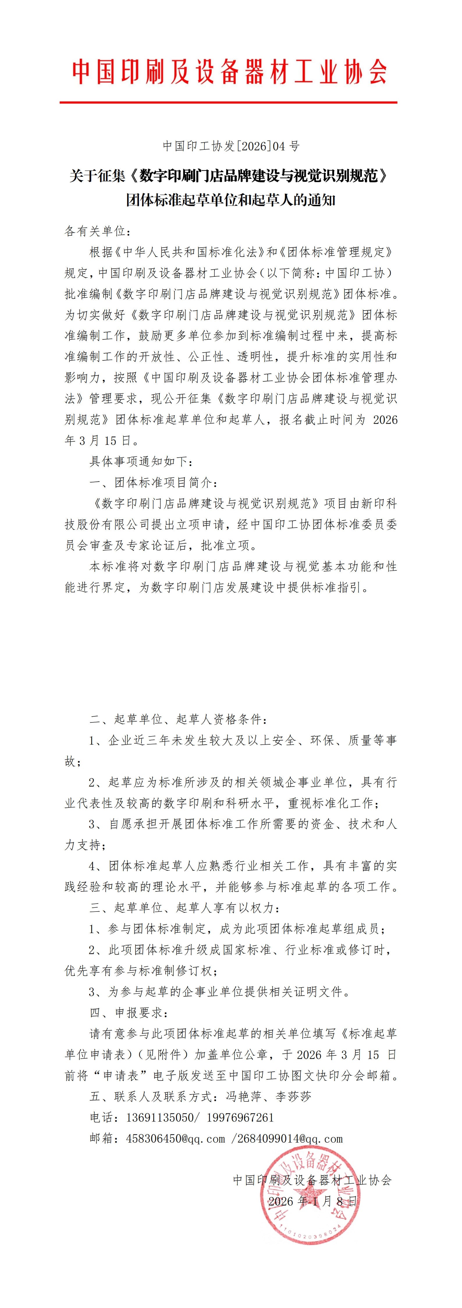 根據《中華人民共和國標準化法》和《團體標準管理規定》規定,中國印刷及設備器材工業協會(以下簡稱:中國印工協)批準編制《數字印刷門店品牌建設與視覺識別規范》團體標準。為切實做好《數字印刷門店品牌建設與視覺識別規范》團體標準編制工作,鼓勵更多單位參加到標準編制過程中來,提高標準編制工作的開放性、公正性、透明性,提升標準的實用性和影響力,按照《中國印刷及設備器材工業協會團體標準管理辦法》管理要求,現公開征集《數字印刷門店品牌建設與視覺識別規范》團體標準起草單位和起草人,報名截止時間為2026年3月15日。