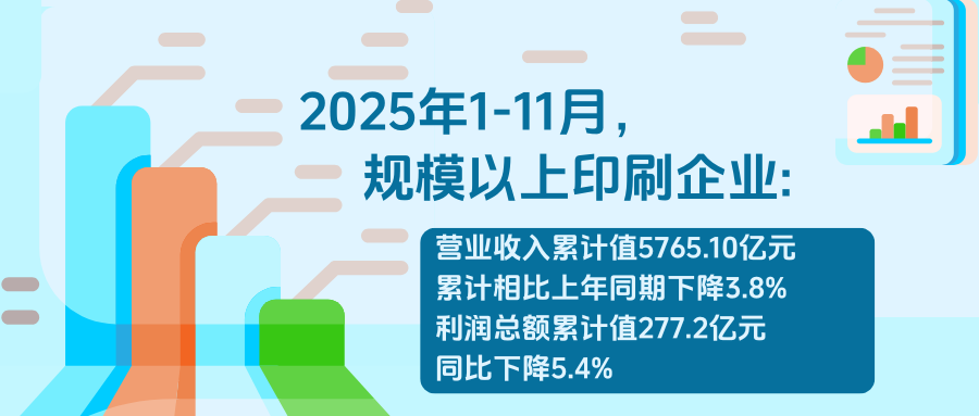 全國:2025年1-11月,規模以上印刷企業營業收入累計值5765.10億元,累計相比上年同期下降3.8%;營業成本累計值4793.5億元,同比下降3.8%;利潤總額累計值277.2億元,同比下降5.4%;應收賬款1419.60億元,同比下降0.3%;出口交貨值累計值547.4億元,同比下降2.9%。同期,規模以上制造業企業利潤總額累計同比增長5%,營業成本同比增長2.4%,營業收入同比增長2.4%。