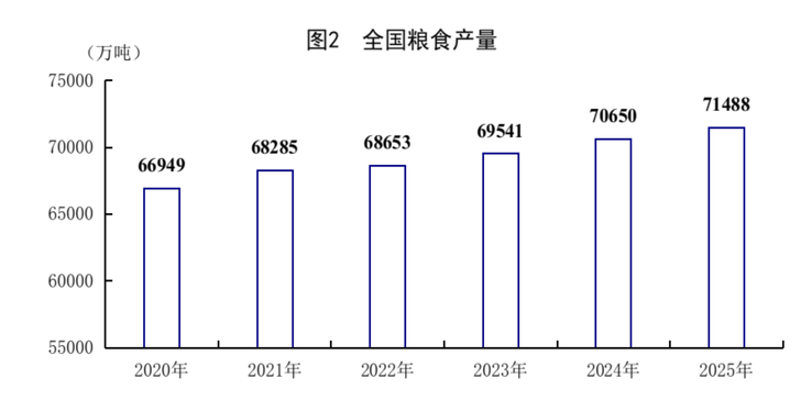 全年全國糧食總產量71488萬噸,比上年增加838萬噸,增長1.2%。其中,夏糧產量14975萬噸,下降0.1%;早稻產量2851萬噸,增長1.2%;秋糧產量53662萬噸,增長1.5%。分品種看,小麥產量14007萬噸,基本持平;玉米產量30124萬噸,增長2.1%;稻谷產量20904萬噸,增長0.7%;大豆產量2091萬噸,增長1.3%。全年豬牛羊禽肉產量10072萬噸,比上年增長4.2%,首次超過1億噸。其中,豬肉產量5938萬噸,增長4.1%;牛肉產量801萬噸,增長2.8%;羊肉產量496萬噸,下降4.2%;禽肉產量2837萬噸,增長6.7%。牛奶產量4091萬噸,增長0.3%;禽蛋產量3498萬噸,下降2.5%。全年生豬出欄71973萬頭,增長2.4%;年末生豬存欄42967萬頭,增長0.5%。