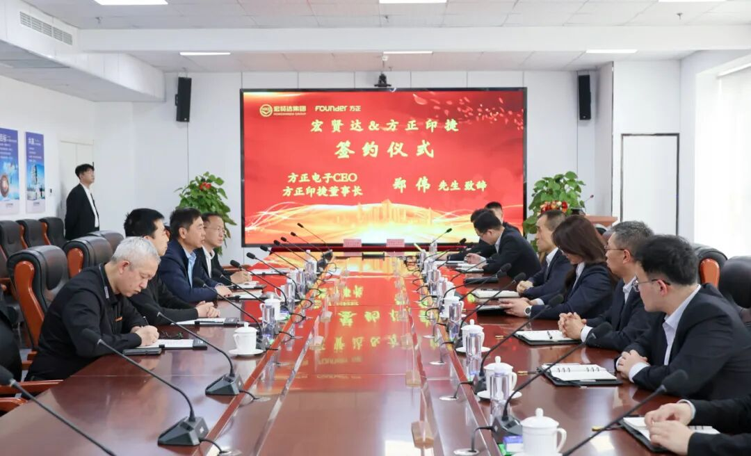 方正電子CEO、方正印捷董事長鄭偉,宏賢達集團董事長、總裁張俊賢及雙方代表出席儀式。