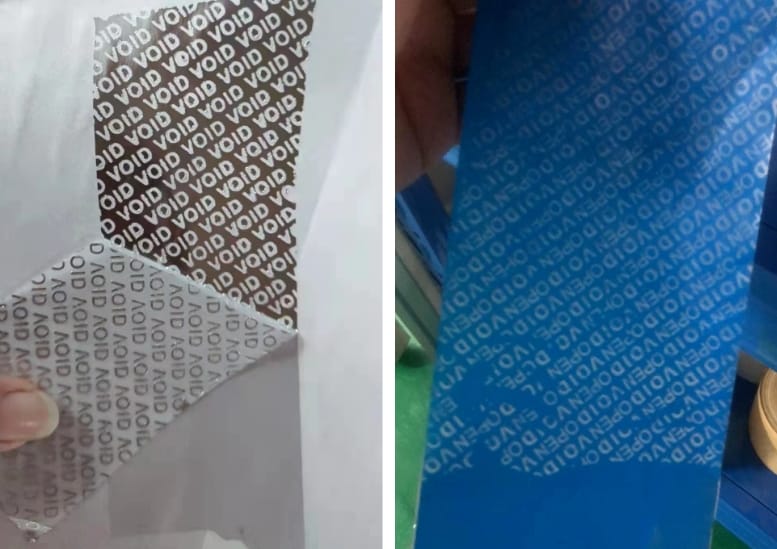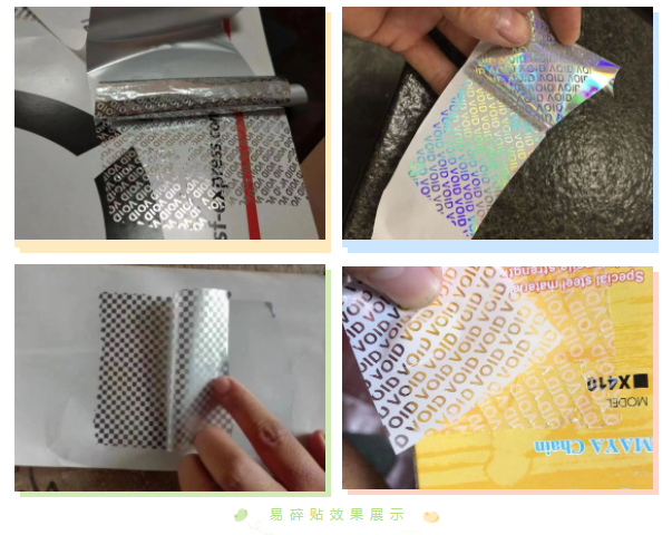 合成易碎紙不干膠材料具有易碎分層的特點,采用高強度持粘能力的粘合劑,其粘合能力遠大于面材本身的易碎分層強度,合成易碎紙不干膠面材經印刷,模切等工序加工后制成易碎貼,貼到商品上就不能完整揭下來,從而避免了造假者利用真品商標來推銷假冒偽劣商品的可能。