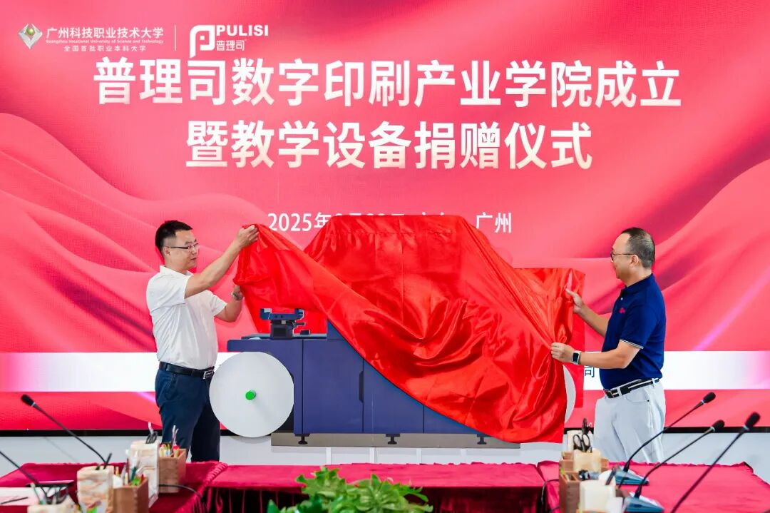 在與會領導、師生代表的共同見證下,廣州市普理司科技有限公司董事長林小博與廣州科技職業技術大學副校長張浩正式簽訂了“普理司數字印刷產業學院”的戰略合作協議,為校企深度合作定下了總框架。隨后,雙方領導共同上臺揭開“普理司數字印刷產業學院”牌匾,標志著雙方正式開啟合作共贏、共謀發展的新征程。