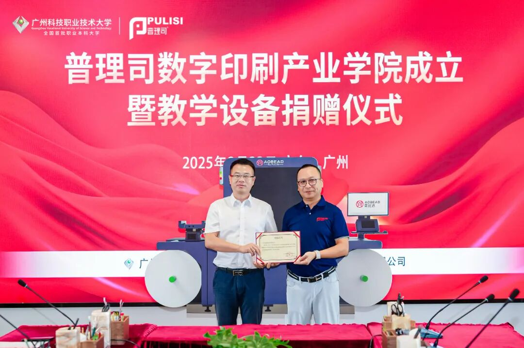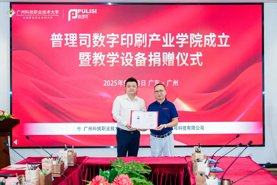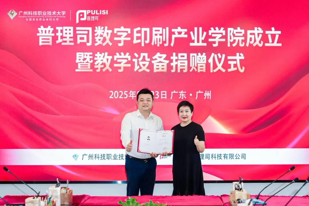 至此,普理司數字印刷產業學院成立暨教學設備捐贈儀式&數字印刷技術產學研協同創新論壇圓滿舉辦。這標志著廣州市普理司科技有限公司與廣州科技職業大學的戰略合作邁上新臺階,是雙方可持續深化“教育鏈、人才鏈、產業鏈、創新鏈”融合的重要里程碑。未來,雙方將充分整合優質資源,打造“人才培養、技術創新、社會服務”三位一體的產教融合平臺,為數字印刷產業突破人才供給瓶頸注入強勁動力。