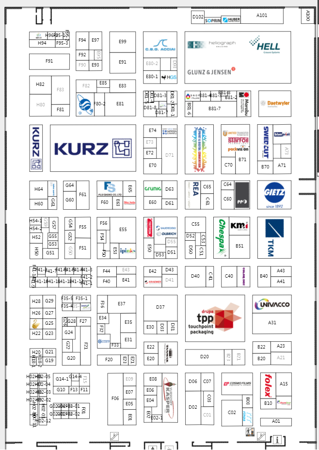 在約140000平方米的凈面積和18個展廳里,所有參展商都將展示各自印刷技術領域的發展趨勢和創新想法。其中,包裝生產和印刷包裝是兩個同樣重要的領域。眾多全球知名展商悉數在列,例如:Bobst,Canon,Comexi,Duplo,EFI,Epson,ESKO,Fujifilm,Heidelberg,Horizon,HP,Kodak,Koenig&Bauer,Kolbus,Komori,Konica Minolta,KURZ,Landa,Müller Martini,Ricoh,Screen,Windm?ller&H?lscher,Xeikon。觀眾可以在www.drupa.de上在線查看參展商的完整名單。