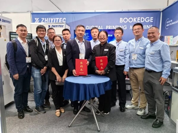 德魯巴印刷展開展次日北京至一在展會(huì)現(xiàn)場與Leo Paper Group利奧紙品印刷集團(tuán)鶴山雅圖仕印刷有限公司舉行三臺(tái)書口美學(xué)印刷機(jī)的簽約儀式