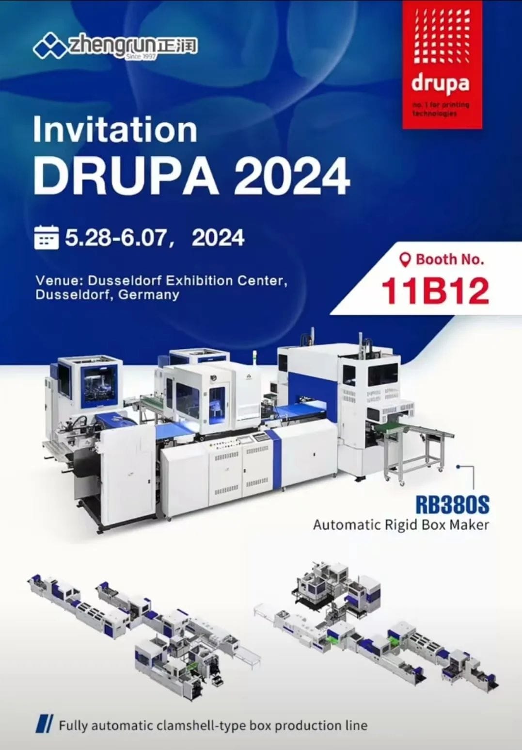 5月28日,全球矚目、時隔八年再度相見的“2024德魯巴印刷展(drupa2024)”在德國杜賽爾多夫展覽館面向全球印刷行業盛大開幕!在近14萬平方米的凈面積和18個展館里,共有來自全球52個國家和地區1646家展商同臺競技。作為中國知名印后設備供應商,浙江正潤機械有限公司(正潤機械)精彩亮相本屆德魯巴印刷展。