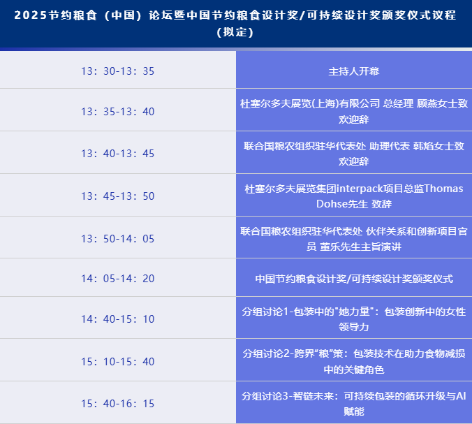 同期,由杜塞爾多夫展覽集團聯合世界包裝組織(WPO)、聯合國糧食及農業組織(糧農組織)、聯合國工業發展組織(UNIDO)共同主辦的中國節約糧食設計獎和可持續設計獎評選活動,將在論壇期間舉辦頒獎儀式。