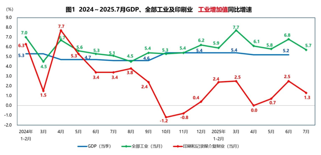 選用工業增加值指標,是用來做對比分析的,幫助我們了解全國經濟走勢、工業經濟情況以及我們印刷業的情況(見圖1)。全國經濟走勢,請看藍線。GDP增速今年一季度為5.4%,二季度為5.2%,上半年的累計增速為5.3%。這個5.3%的增速,相比去年同期和去年全年都提升0.3個百分點,從數據看經濟運行是平穩的,全年實現年初制定的5%目標問題不大。工業經濟走勢,請看綠線。工業增加值的月度增速,今年以來呈現波動態勢,但各月都在5%以上,還不算低。我們印刷業的走勢,請看紅線。在41個大類行業中,印刷業增速的波動幅度是比較大的,而且比全部工業的平均水平低很多,徘徊于微增長區間。