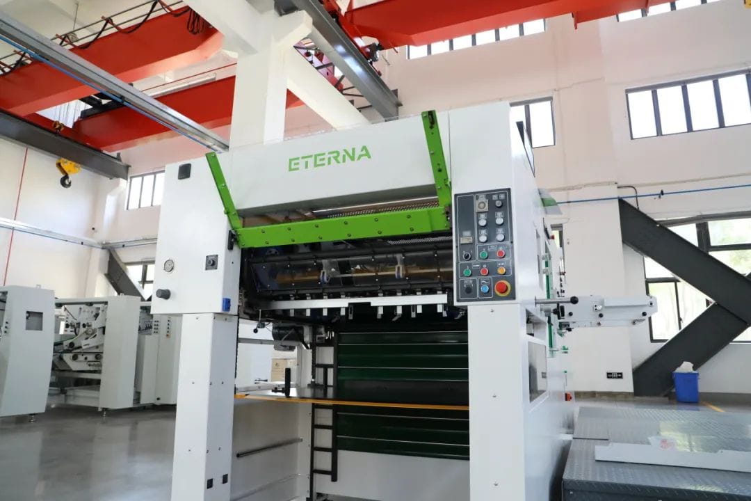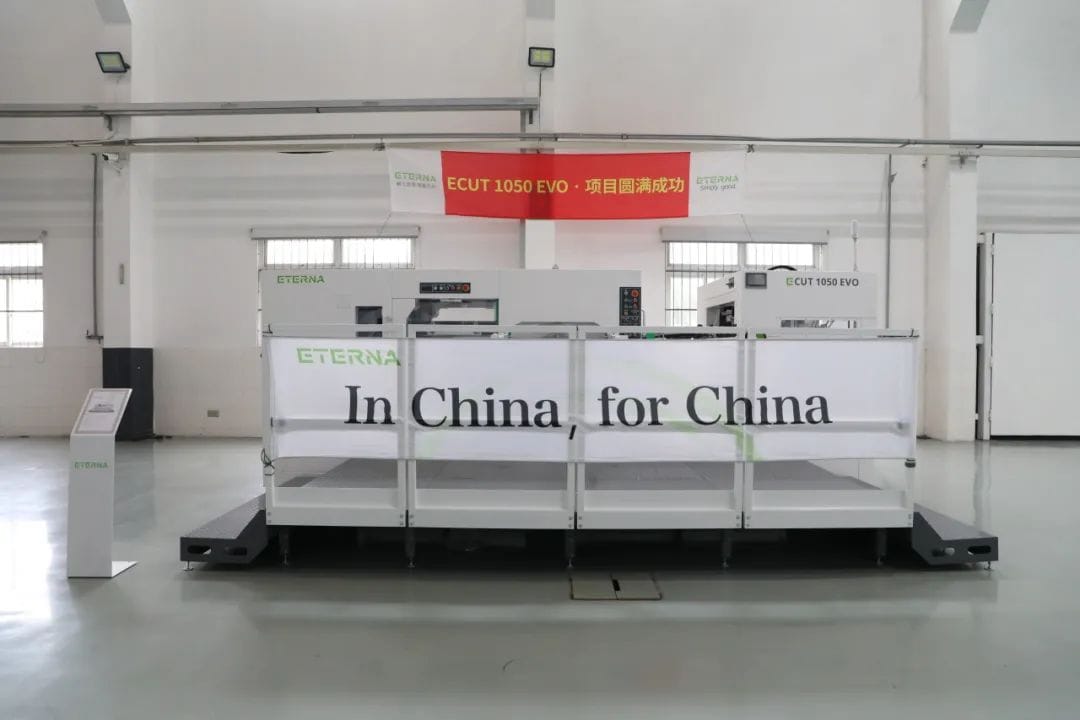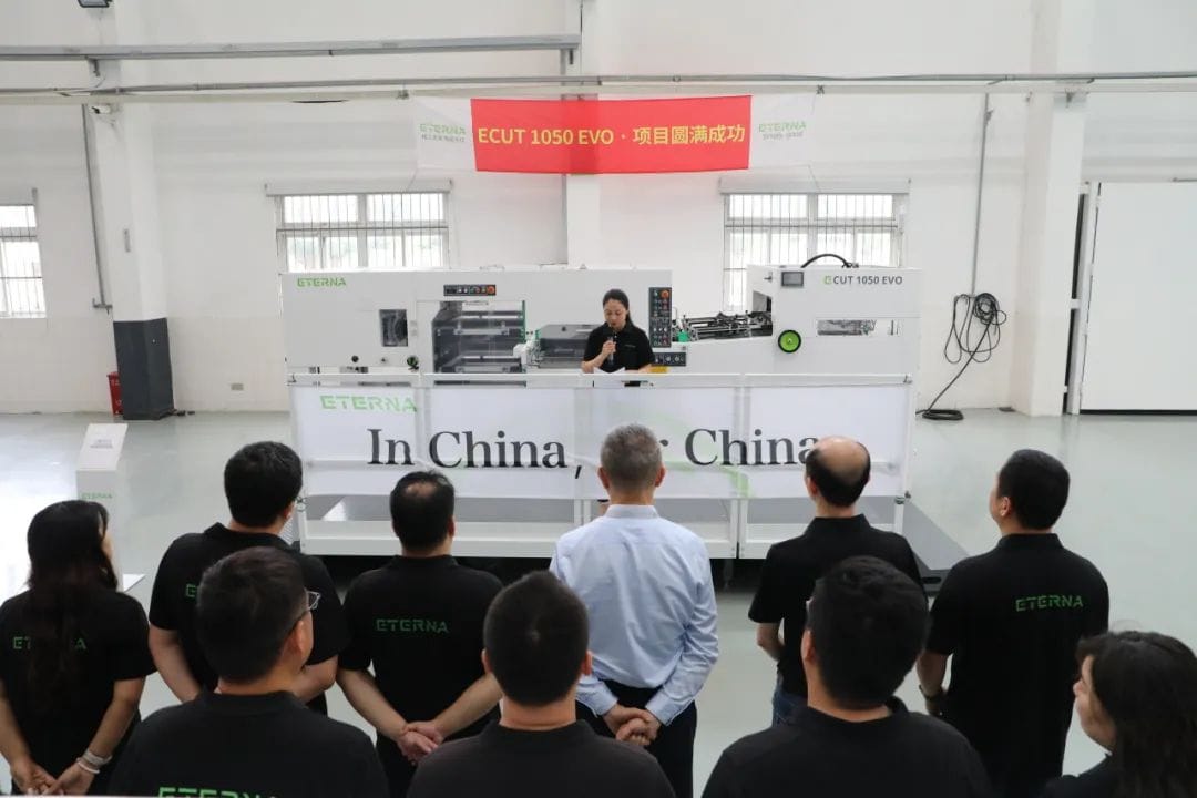 演示中心內一臺具有標志性及創新技術的重磅新品—ECUT 1050 EVO 全自動帶清廢平壓平模切機問世。
