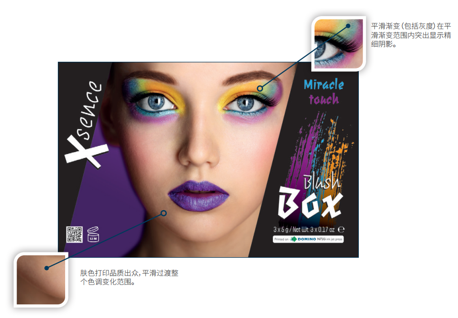 N730i搭配多米諾UV91墨水,此墨水系列具有寬廣的色域,其中包括以70米/分鐘的速度實(shí)現(xiàn)76%遮蓋率的純白色打印,并且具備優(yōu)異的抗紫外線性、附著力和耐磨性,確保印刷圖像栩栩如生。