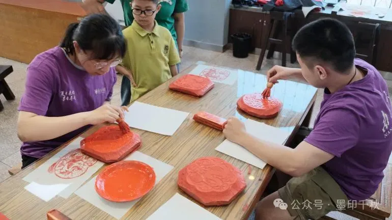 一開始,他們的印刷過程并不順利,在經過志愿者的講解后終于摸清了印刷要點。首先拿出一張宣紙,然后用墨水輕刷模板,找出宣紙上相對光滑的一面并覆蓋在模板上,最后用刷子輕刷宣紙,等墨水印在上面再緩緩將其揭開。這樣一張簡易的雕版印刷畫就輕松完成了。經過嘗試摸索,他們駕輕就熟地完成了自己手頭作品的印刷。在歡聲笑語中,團隊成員不僅體驗了印刷的樂趣,更深刻感受到了傳統技藝在新時代煥發的無限活力。